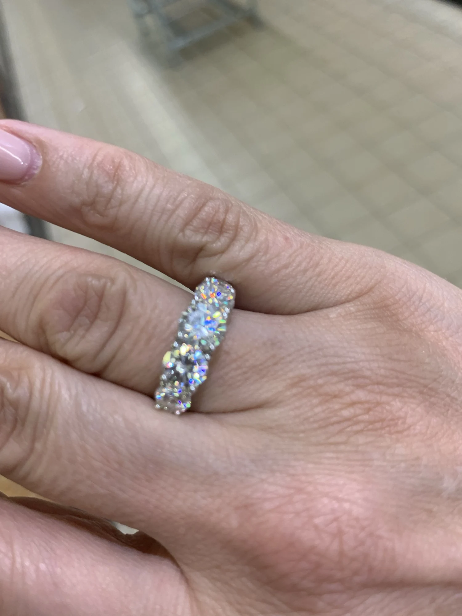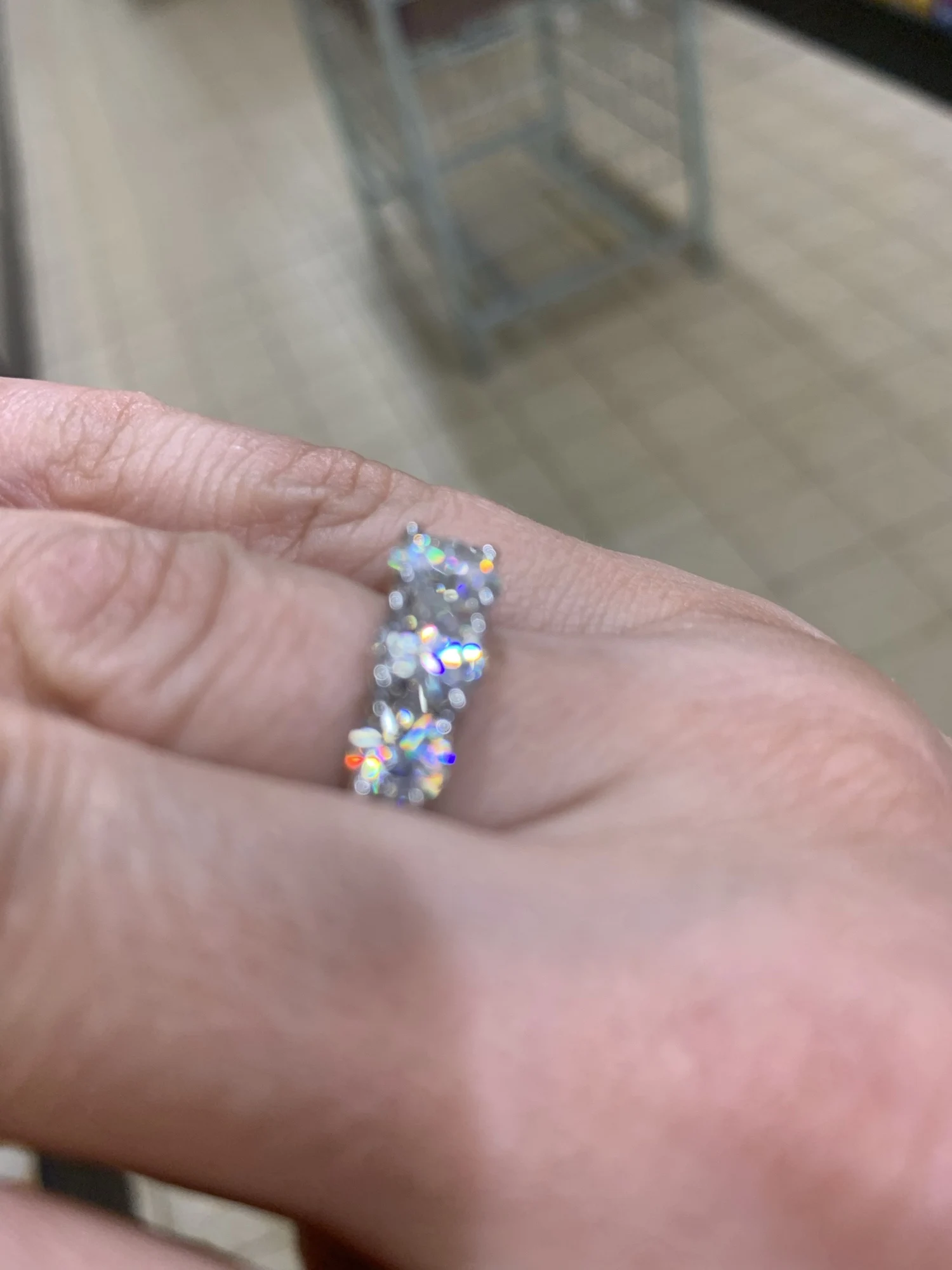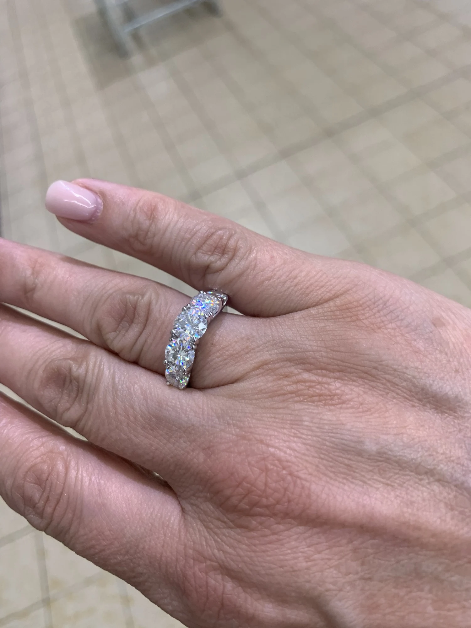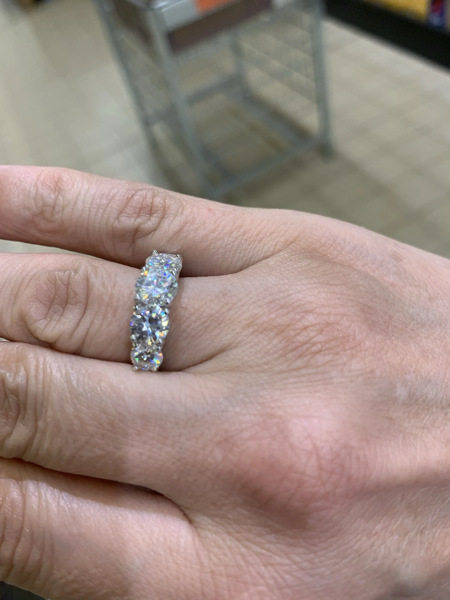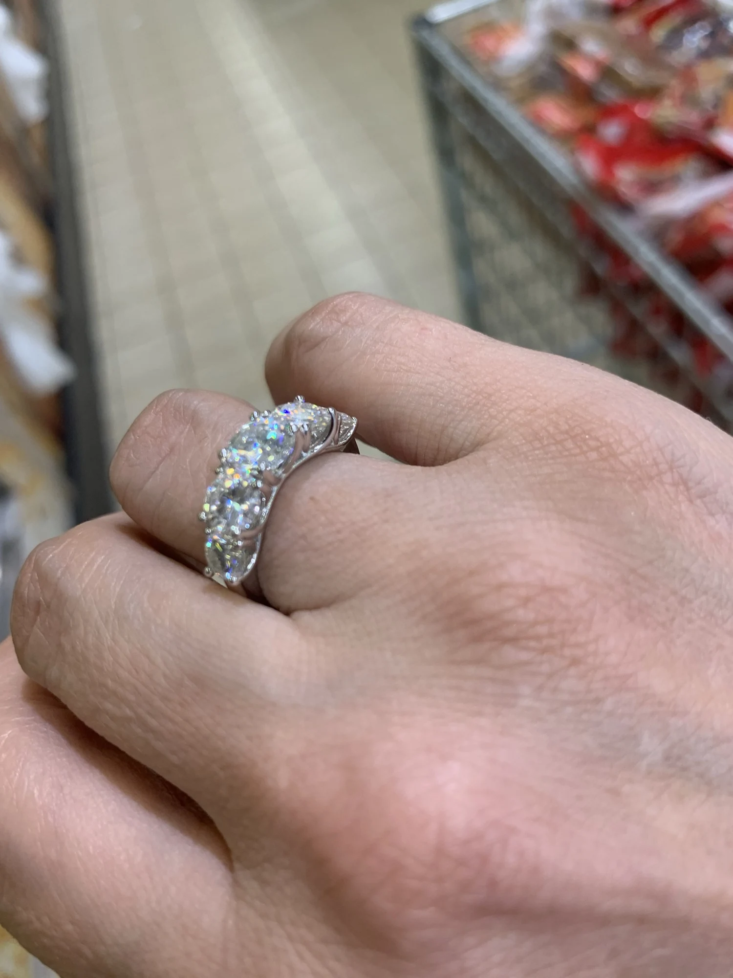 Beautiful ring! In the sun and under artificial spot lighting - it shines like a fire! But even without suitable lighting, it looks beautiful. Lightweight and comfortable, everyone likes it. 😍 In the last photo next to the diamonds. Photo in the car - on a cloudy day, without direct sunlight. With a slight difference in appearance, moissanites are easily distinguishable from diamonds; diamonds look more understated but have a sharper brilliance. This is especially noticeable in the product, even though the loose stones look the same. But that doesn't change the fact that the ring is fantastic! I just don't recommend squeezing it out like a diamond. 😄 I would immediately understand that these are pretentious.